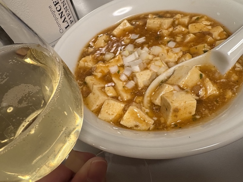 麻婆豆腐の複雑なスパイス(豆板醤や花椒)の風味と、ランスロ・ピエンヌの持つ複雑な熟成香がケンカせず、むしろ香りの要素として重なり合い、このペアリングは合う!