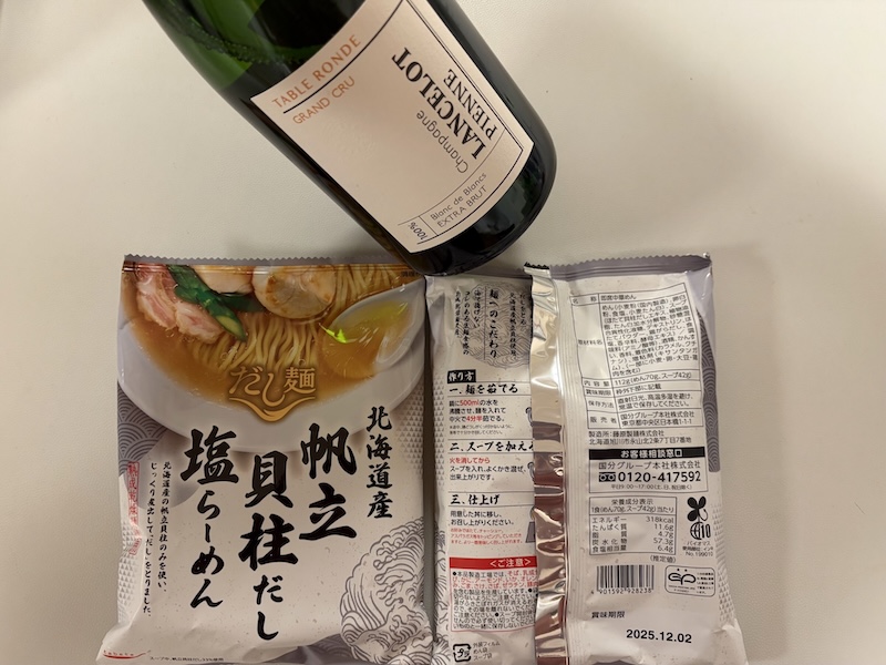 バターを一かけ落とすと、帆立スープの塩ラーメンとも、シャルドネのシャンパーニュとも相性良し。スイートコーンを散らしてもよかったかも。