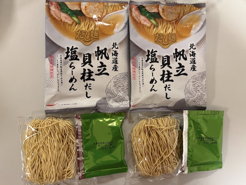 この「ほたて貝柱だし塩ラーメン」は、袋麺なので具は入っていませんが、スープが貝柱の香りと旨みたっぷり。