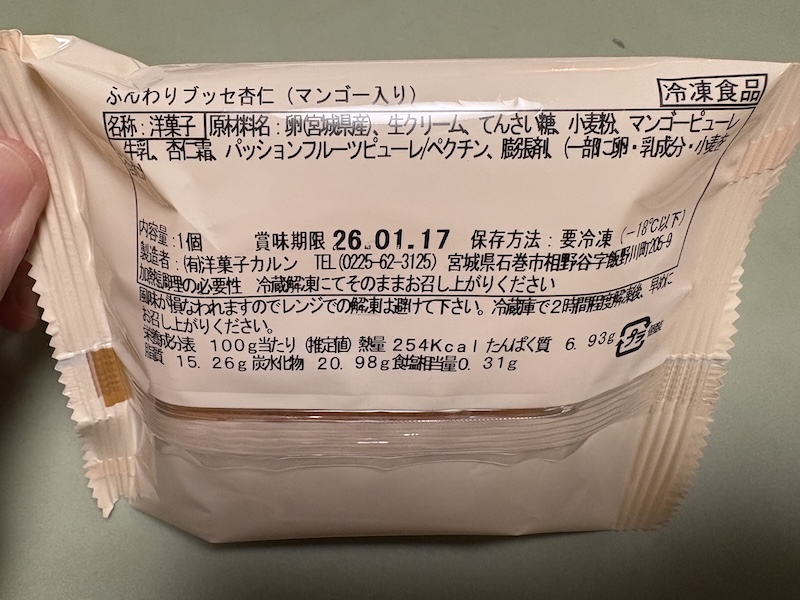 - 特徴:宮城県産卵と牛乳を使用したふわふわの生地で、杏仁の香りをつけた北海道産生クリームと、マンゴー果肉入りのジャムをサンドしているのが特徴